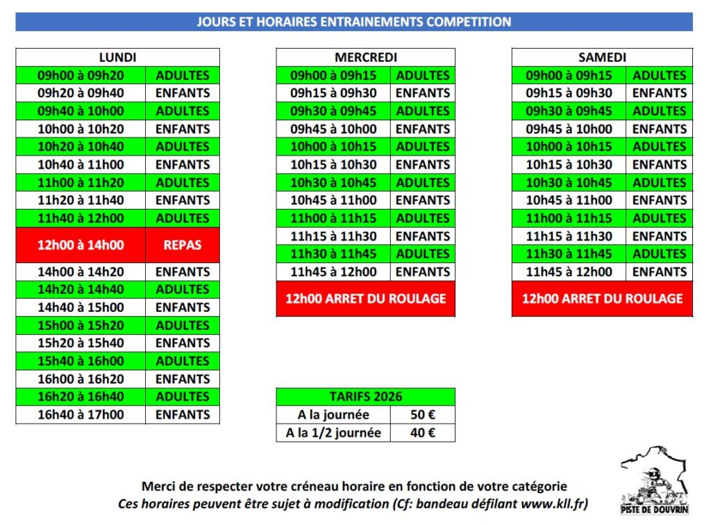 Les premiers lundi de chaque mois la piste ne sera pas accessible aux entrainements compétition.